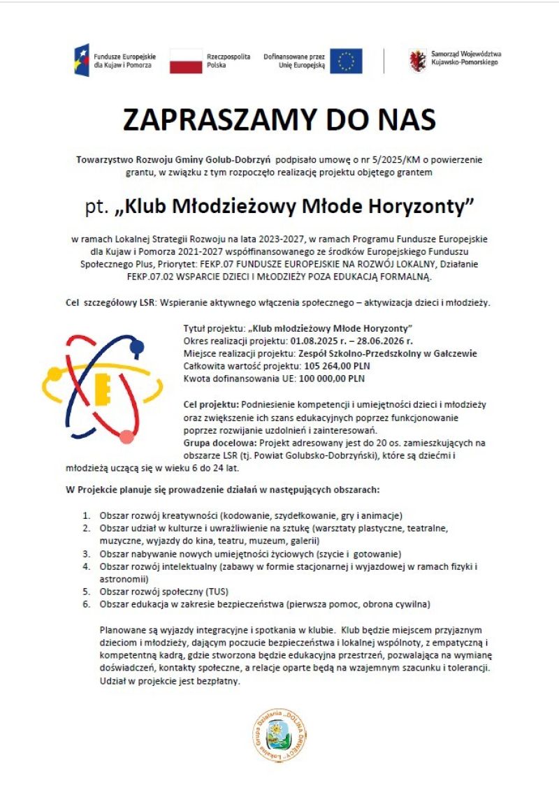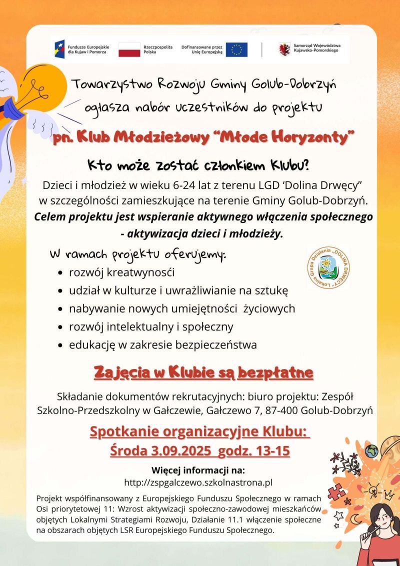 Stowarzyszenie Lokalna Grupa Działania „Dolina Drwęcy” i Zarząd Województwa Kujawsko-Pomorskiego wraz z Towarzystwem Rozwoju Gminy Golub-Dobrzyń zapraszają dzieci i młodzież uczące się w wieku od 6 do 24 lat, zamieszkałe na terenie powiatu golubsko-dobrzyńskiego do uczestnictwa w projekcie objętym grantem pt. „Klub Młodzieżowy Młode Horyzonty” w ramach Programu Fundusze Europejskie dla Kujaw i Pomorza 2021-2027 współfinansowanego ze środków Europejskiego Funduszu Społecznego Plus, Priorytetu 7. Fundusze europejskie na rozwój lokalny, w ramach Działania FEKP.07.02 Wsparcie dzieci i młodzieży poza edukacją formalną.