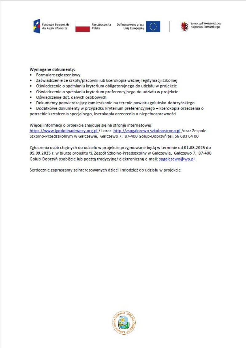 Zgłoszenia osób chętnych do udziału w projekcie przyjmowane będą w terminie od 22.08 do 05.09.2025 r. w biurze projektu tj. Zespół Szkolno-Przedszkolny w Gałczewie, Gałczewo 7, 87-400 Golub-Dobrzyń osobiście lub pocztą tradycyjną/ elektroniczną e-mail: spgalczewo@wp.pl
